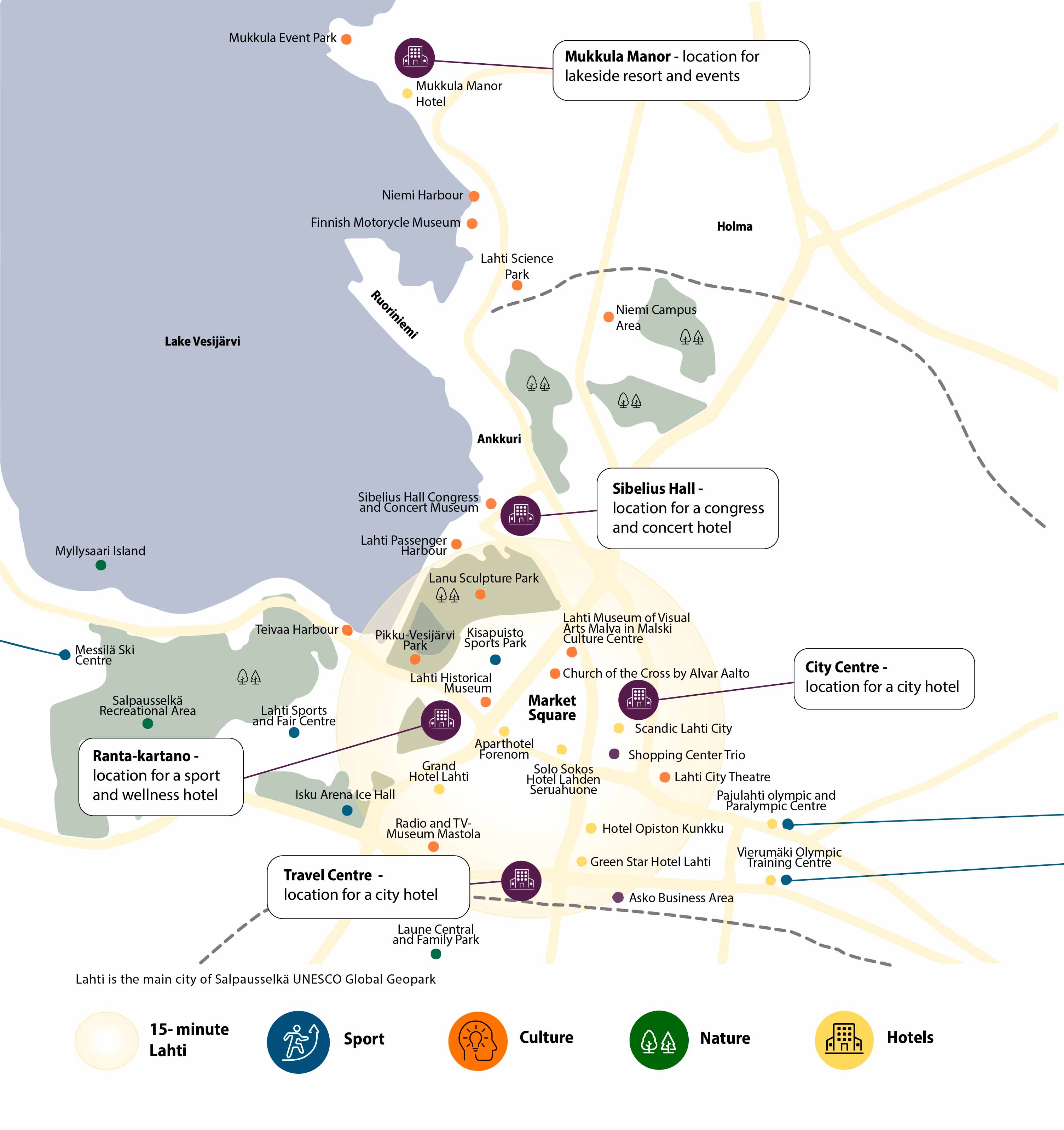 Lahti on nopeasti kehittyvä Euroopan ympäristöpääkaupunki, todellinen ympärivuotinen kohde liiketoiminnalle, kongresseille, tapahtumille ja vapaa-ajan matkailijoille. Se tarjoaa lukuisia mahdollisuuksia hotellialan ammattilaisille ja potentiaalisille sijoittajille. Kaupunki tunnetaan maailmanluokan maastohiihtoladuista, suurista kansainvälisistä urheilutapahtumista, eloisista festivaaleista ja kulttuuritapahtumista.